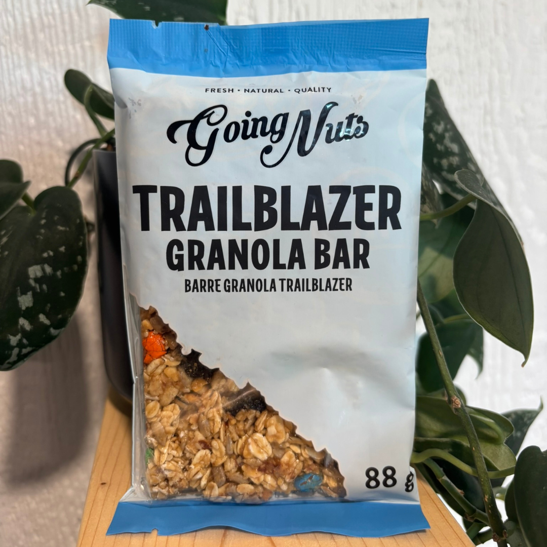 Trailblazer Granola Bar: Savour the perfect blend of wholesome ingredients in our handmade granola bar, crafted with organic gluten-free oats, creamy peanut butter, raisins, and candy-coated chocolate.