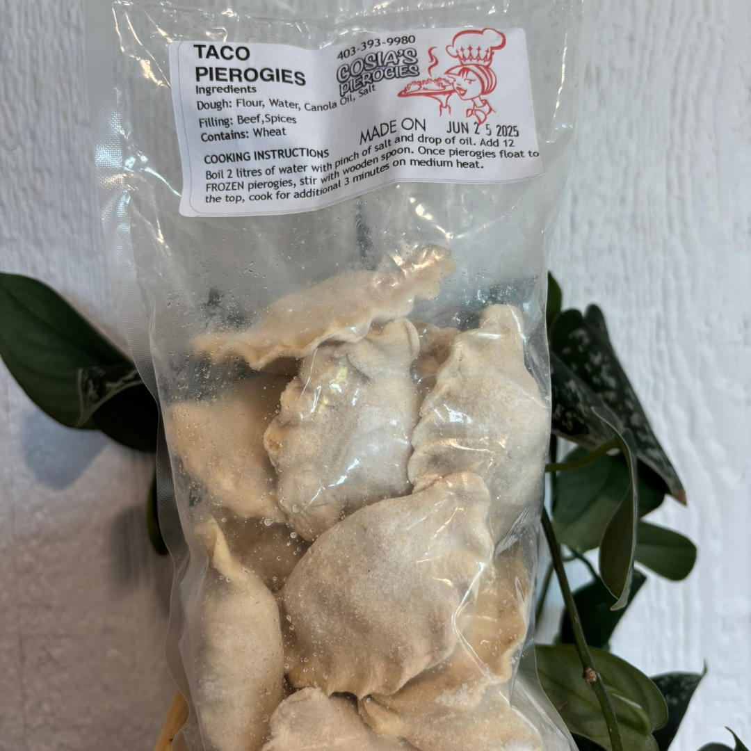 Description:ย 'Homemade' style pierogies from Gosia's Pierogies! Delicious, especially when served with a dollop of sour cream, fresh green onions and bacon!